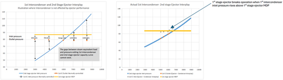 The first intercondenser’s performance curve, with respect to NCG loading, will not match that of the second-stage ejector. Only at the design point will there not be a mismatch between ejector and condenser performance curves.
