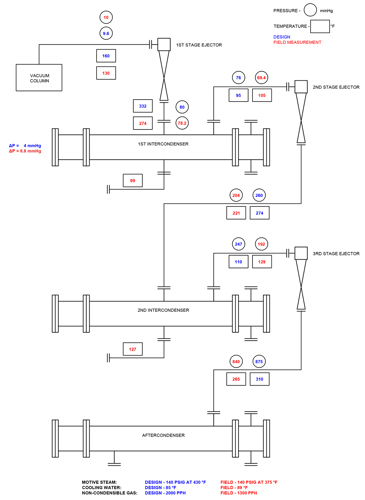FIG. 3 is an actual VDU ejector system survey comparing field measurements to design values. Operating conditions were NCG underloading and, consequently, the second-stage ejector was overventing the first intercondenser. The field measurements showed that the first intercondenser’s shell-side pressure was more than two times the design. There was no design flaw or poor performance within the first intercondenser. This is simply an illustration of ejector-condenser interplay when overventing occurs. The vacuum column overhead is essentially at design, the third-stage ejector suction pressure is 55 mmHg below design and the first intercondenser field measurements reflect 8.8 mmHg pressure drop rather than the design of 4 mmHg. The high pressure drop is due to low NCG loading and overventing.