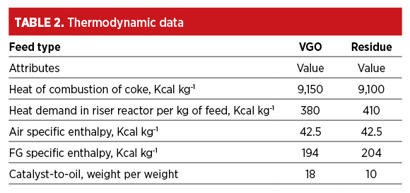 To understand the implication of oxy-combustion on the overall heat balance of an FCCU, multiple cases at different O2 levels in SA have been worked out. The critical process parameters of the FCCU processing VGO and residue feeds are given in TABLE 1. The heat of combustion, enthalpy of flue gas and air, and the reactor heat demand of the unit corresponding to Base Case operation without oxy-combustion are given in TABLE 2.