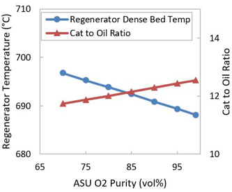 In this case, the flue gas enthalpy increases up to 1.4 times as that of the Base Case indicated in FIG. 8, and the regenerator temperature is reduced by up to 30°C depending on the ASU O2 concentration, as indicated in FIG. 9. To maintain the riser reactor temperature, the catalyst-to-oil ratio increases from 10 to 12 weight per weight. The above observations are applicable for both FCCUs and RFCCUs.