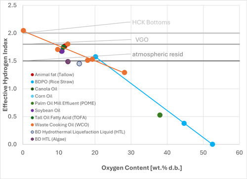 FIG. 2. EHI3 vs. feed oxygen content of a selection of different bio-derived feeds.