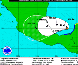 However, another storm may loom in the near future. Tropical Storm Nate formed late Wednesday near the Bay of Campeche off Mexicos Yucatan Peninsula, and it strengthened early Friday to peak wind speeds of 65 miles/hour.