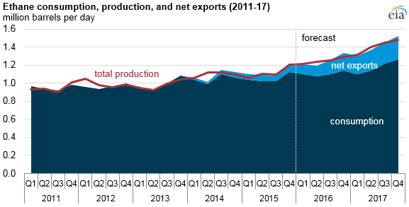 The EIA's "Short-term energy outlook" expects annual average ethane net exports to increase from 60 Mbpd in 2015 to 230 Mbpd in 2017, as new export facilities and ethane-carrying ships enable ethane to reach overseas markets.