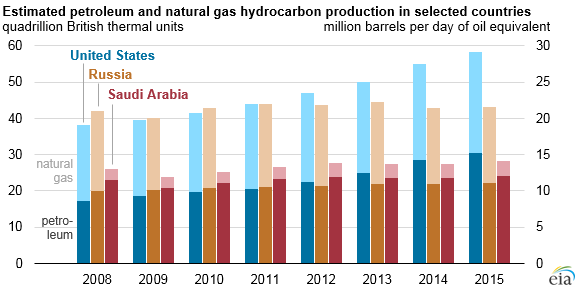 The increase in petroleum and natural gas production can be directly attributed to production from tight oil and shale gas formations. Several factors kept hydrocarbon production increases in Russia lower than those in the US. In Russia, natural gas production declined due to poor economic conditions and a mild winter, which resulted in lower domestic natural gas demand. Russia's total combined production of petroleum and natural gas increased by just 0.1 quadrillion Btu in 2015.
