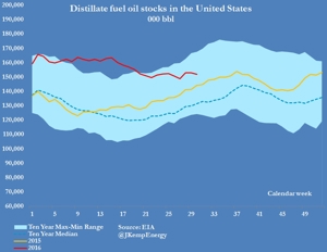 Stocks of distillate fuel oil are higher than normal but have been trending down for the last 15 weeks according to the US Energy Information Administration.