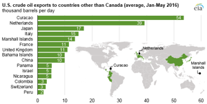 In recent years, crude oil exports to destinations other than Canada were often re-exported volumes of foreign crude oil or cargoes of Alaskan crude oil, which were both exempt from export restrictions. The number and variety of destinations for US crude oil exports has increased since the lifting of restrictions. So far in 2016, US crude oil has been exported to 16 different nations, totaling 501 Mbpd.