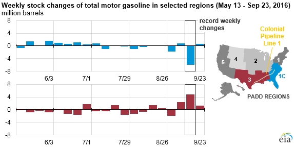 Petroleum refineries in the Gulf Coast stored or exported motor gasoline that could not be moved to the East Coast during the pipeline outage. The Gulf Coast region, which is home to most of the US's refinery capacity, typically has the largest inventory of motor gasoline in the US, with nearly 79 MMbbl of motor gasoline, or 35% of the national total as of September 9. The increase of 4.8 MMbbl over the following week surpassed previous high weekly builds of 4.7 MMbbl in early October 2008 and 4.6 MMbbl in early November 2012.