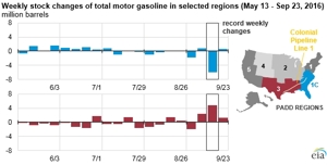 The outage of Colonial Pipeline Line 1 between September 9 and September 21 resulted in record changes in motor gasoline stocks in both the Lower Atlantic and Gulf Coast states during the week ending September 16. Colonial's Line 1 is the largest gasoline supply pipeline linking the Gulf Coast—home to roughly half of the nation's refining capacity—to the Lower Atlantic, a major demand region that has no petroleum refineries.