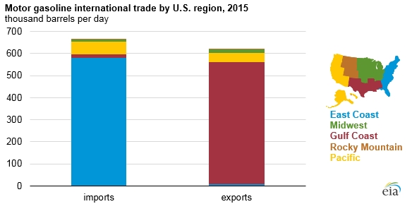 The US simultaneously imports and exports gasoline, because of regional differences in gasoline supply and demand balances. The two regions with the largest supply and demand imbalances are the East Coast, which imported 581 Mbpd of gasoline in 2015, and the Gulf Coast, which exported 551 Mbpd of gasoline in 2015.