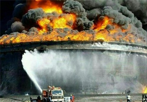 The naphtha tank explosion and fire in July (shown) was the largest in Iran petrochemical history. This latest fire took place at the previously destroyed tank. (Image courtesy of Tasmin News)