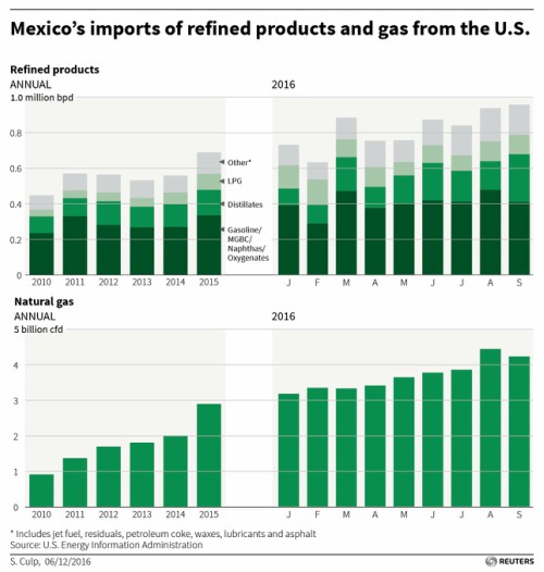 "We are expecting Mexico's imports from the US to increase to an average of 900,000 bpd in 2017... imports would surpass 1 MMbpd at times in 2017 if private imports become significant after price liberalization," said Robert Campbell, head of oil products research at Energy Aspects.