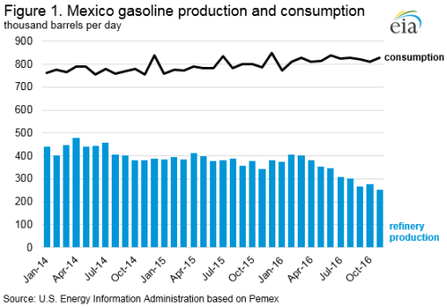 Mexico’s refineries have historically been running at low utilization rates because they are challenged to produce clean gasoline and distillate fuels from the available marginal barrel of heavy sour crude oil. More recently, outages have hampered Mexico’s six refineries, which had a total output (including non-gasoline products) of 1.1 MMbpd through November 2016, down from 1.3 MMbpd over the same months in 2015. Mexican refinery output of gasoline fell steeply to 381,000 bpd in 2015 and then fell again to 333,000 bpd in 2016 (through November). Refinery utilization rates in Mexico declined in 2016 from 78% in January to 60% in November, creating a widening gap between domestic supply and demand.