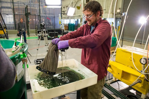 At tests at a giant seawater tank in New Jersey called Ohmsett, the National Oil Spill Response Research & Renewable Energy Test Facility, the Oleo Sponge successfully collected diesel and crude oil from both below and on the water surface.