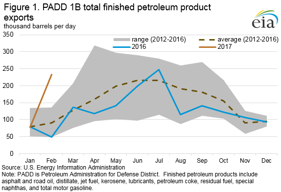 EIA: Petroleum product exports from Central Atlantic US unusually high in February