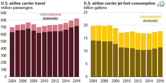 The amount of jet fuel consumed by US airlines increased in both 2015 and 2016, although jet fuel use in 2016 remained 11% lower than its level a decade ago. Jet fuel use was lower despite the fact that the number of passengers traveling on US carriers in 2016 was 7% higher than in 2007.