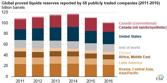 Annual reports of 68 publicly traded oil companies indicated that their aggregate proved liquids reserves declined in 2016 for the second consecutive year. The decline in proved reserves was heavily concentrated in a few companies that reduced their estimated reserves from Canadian oil sands projects. Downward revisions of existing resources, relatively low extensions and discoveries, and relatively high production also contributed to a decline in proved reserves.