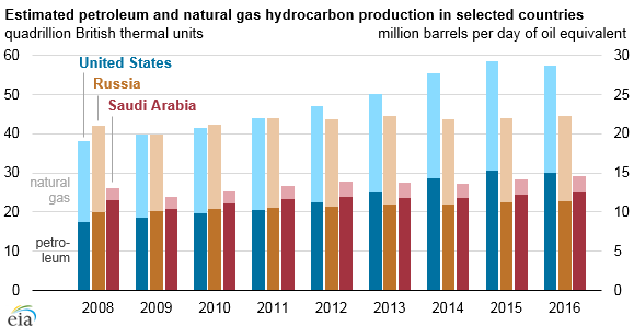 The US remained the world's top producer of petroleum and natural gas hydrocarbons in 2016 for the fifth straight year despite production declines for both petroleum and natural gas relative to their 2015 levels. The US has been the world's top producer of natural gas since 2009, when US natural gas production surpassed that of Russia, and it has been the world's top producer of petroleum hydrocarbons since 2013, when its production exceeded Saudi Arabia’s.