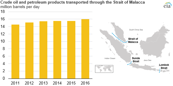 Nearly one-third of the 61% of total global petroleum and other liquids production that moved on maritime routes in 2015 transited the Strait of Malacca, the second-largest oil trade chokepoint in the world after the Strait of Hormuz. Petroleum and other liquids transiting the Strait of Malacca increased for the fourth time in the past five years in 2016, reaching 16 MMbpd.