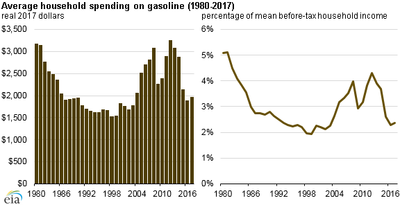 The average US household expenditure on gasoline in 2017 is expected to total $1,977, or approximately 2.4% of mean incomes of households, according to projections in EIA’s most recent Short-Term Energy Outlook (STEO). The most recent peak for household gasoline expenditures was $2,715, or 4.0% of household income, in 2008. More recently, average household gasoline expenditures in 2015 and 2016 were near or below $2,000, or 2.5% of total household income.
