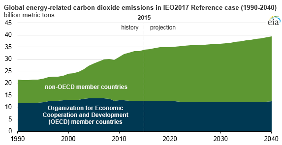 EIA projects that growth in global carbon dioxide (CO2) emissions from energy-related sources will slow despite increasing energy consumption. EIA’s International Energy Outlook 2017 (IEO2017) Reference case projects that energy-related CO2 emissions will grow 0.6% per year from 2015 to 2040, a slower rate of growth than the 1.8%/yr experienced from 1990 to 2015. Emissions from countries outside the Organization for Economic Cooperation and Development (OECD) account for all of EIA’s projected growth in energy-related CO2 emissions.
