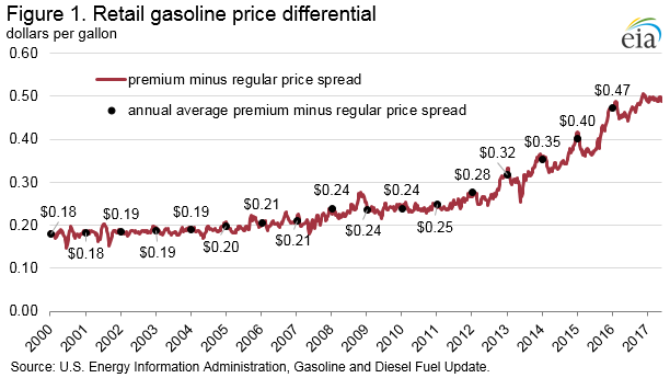 In late 2016, the difference between US average retail prices for premium and regular gasoline reached 50 cents/gal. This price spread has been generally expanding since 2000, and the rate at which the spread has grown has accelerated over the past 3 yr. Many factors on both the supply and demand sides are likely influencing this trend.