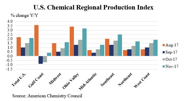 Compared to November 2016, US chemical production was ahead 2.4% on a year-over-year basis, an improving trend. Chemical production was ahead of year ago levels in all regions.