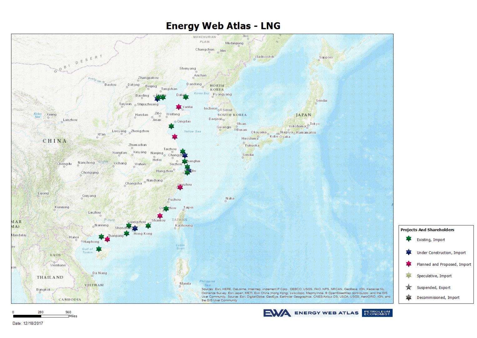 Natural gas storage capacity in China is relatively limited, estimated at just 3% of total natural gas consumption. China’s seasonal peak demand is met primarily by natural gas imports, either by pipeline from Central Asia or by shipments of LNG. Despite increases in China’s domestic production and in pipeline imports in 2017, natural gas shortages in northern China led to record levels of LNG imports during the 2017 winter. Overall, natural gas imports accounted for 40% of China’s 2017 natural gas supply, and LNG made up more than half of those imports.