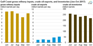 Although many export facilities in the Gulf Coast reduced operations or shut down because of Harvey, export facilities returned to operation following the hurricane faster than refineries. Exports of crude oil in August were the second lowest for 2017 at 772,000 b/d, but in September they reached a then-record high of 1.5 million b/d, most of which went to Asian markets. Inputs to refineries in the Gulf Coast region began reaching pre-Harvey levels in October.