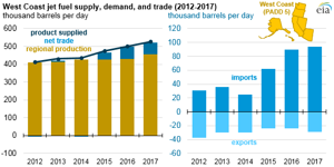 West Coast jet fuel consumption increased by 6% in 2016 and by another 5% in 2017, averaging 527 Mbpd through December. In particular, Alaska and Hawaii have higher per capita jet fuel use because of their remote locations, using thirteen and five times the national average, respectively.
