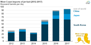Increased imports of jet fuel into the West Coast created an opportunity for Asian refineries to supply jet fuel to the region. These imports came primarily from South Korea, China, and Japan. In 2016, West Coast jet fuel imports from these three countries totaled 87 Mbpd, or 96% of total jet fuel imports into the West Coast. In 2017, West Coast jet fuel imports from these countries increased again, reaching 93 Mbpd and accounting for 99% of total imports into the region.