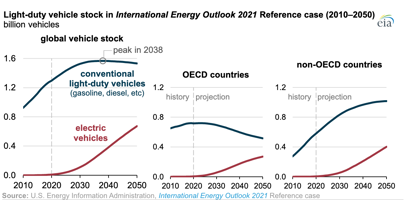 In the EIA's International Energy Outlook 2021, they estimate the global light-duty vehicle (LDV) fleet contained 1.31 B vehicles in 2020, and they project this fleet will grow to 2.21 B vehicles by 2050. The EIA projects electric vehicles (EVs)—any LDV with a charging plug—will grow from 0.7% of the global LDV fleet in 2020 to 31% in 2050, reaching 672 MM vehicles. Significant growth in EV sales and shares of sales through the projection period results in the global conventional gasoline and diesel LDV fleet peaking in 2038.