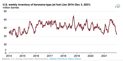 On November 26, U.S. jet fuel inventories were at their lowest level since late 2014, according to the EIA's weekly petroleum status report. Refineries produced less jet fuel in October compared with this summer, and since August, jet fuel demand has increased to near pre-pandemic levels. This increased demand, along with reduced production, has caused inventories to decline.