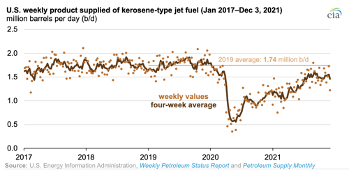 Jet fuel demand (measured as product supplied) has been well below its 2019 average of 1.74 MMbpd since the onset of the COVID-19 pandemic. In most weeks since mid-August, jet fuel consumption has been within 20% of 2019 levels, according to the weekly petroleum status report. By comparison, in November 2020, U.S. jet fuel demand averaged 1.13 MMbpd, or about two-thirds of its 2019 average value.