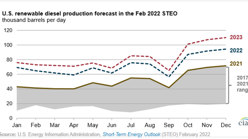 The February STEO also includes the EIA’s forecast that U.S. production of other biofuels (a much smaller market than biodiesel and renewable diesel) will increase in 2022 and 2023 due to increased production of sustainable aviation fuel.