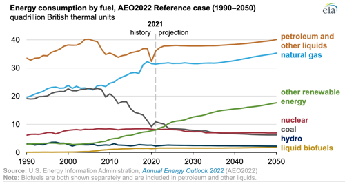 (EIA) — The EIA projects that U.S. energy consumption will grow through 2050, primarily driven by population and economic growth. In this case, which reflects only current laws and regulations, renewable energy is the fastest-growing energy source through 2050, and petroleum remains the largest share of energy consumption throughout that period, followed by natural gas.
