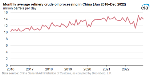 According to China’s General Administration of Customs, refiners in China processed an average of 13.5 MMbpd of crude oil last year, a 4% decrease from 2021's record high of 14 MMbpd. The 2022 reduction in crude oil processing was greatest from April through August, when refiners in China processed an average of only 12.5 MMbpd.