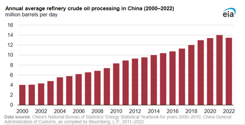Less domestic demand for crude oil reduced refining activities in China last year. Demand for petroleum products in China declined in response to COVID-19 outbreaks and related mobility restrictions in major cities, including Shanghai. These restrictions significantly slowed China’s economic activity.