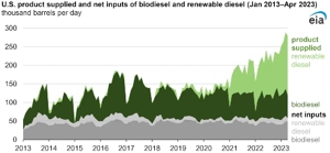 In January 2022, U.S. renewable diesel consumption surpassed biodiesel consumption for the first time and has continued to increase since then. Renewable diesel consumption has grown relative to biodiesel consumption because: