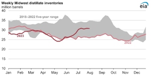 Midwest distillate inventories for the week of July 14 were the highest since February 2022. The Midwest has historically sent refined products, including distillate, to the East Coast for consumption and to the Gulf Coast for export. From June 1 through this September, the barge shipping lanes on the Illinois River that connect Lake Michigan and the Mississippi River are limited because of maintenance on the locks and dams. Several of the locks and dams are scheduled to be closed for an estimated four months. The maintenance is limiting the ability to move products out of the Chicago region by barge to other markets.