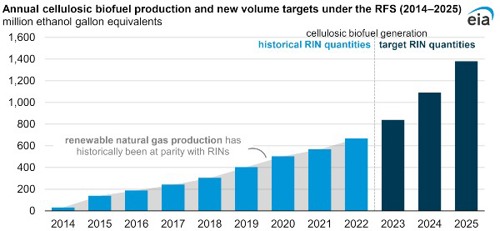 On June 21, 2023, the U.S. Environmental Protection Agency (EPA) announced a final rule that established biofuel volume requirements and standards for cellulosic biofuel for 2023–25 as part of the Renewable Fuel Standard (RFS) program. The cellulosic biofuel category primarily applies to Renewable Natural Gas (RNG), a form of natural gas made from biogas. The rule increases volume targets for cellulosic biofuel by 25% to 840 million gallons in 2023, by 29% to 1.09 billion gallons in 2024, and by 33% to 1.38 billion gallons in 2025 compared with the previous target.