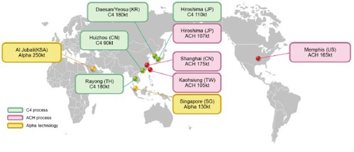 As a leading company in the MMA business, the MCG Group produces MMA monomers by three different methods (ACH process, C4 process, and Alpha technology) at its MMA monomer production bases around the world, while enhancing the supply chain in response to the demand-supply situation and trends with regard to materials used for production.