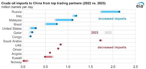 The next largest increases in China’s crude oil imports came from Iran, Brazil, and the United States. Customs data indicate that China imported 54% more crude oil (1.1 million b/d) from Malaysia in 2023 than in 2022. However, crude oil imports from Malaysia exceeded Malaysia’s total crude oil production. Industry analysts believe that much of the oil shipped from Iran to China was relabeled as originating from countries such as Malaysia, the United Arab Emirates, and Oman to avoid U.S. sanctions against countries engaging in petroleum transactions with Iran. In 2023, China increased crude oil imports from Brazil by 52%, from 498,000 b/d to 755,000 b/d, and from the United States by 81%, from 158,000 b/d to 286,000 b/d.