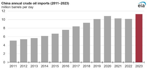 China, the world’s largest importer of crude oil, imported 11.3 million barrels per day (b/d) of crude oil in 2023, 10% more than in 2022, according to China customs data. Refiners in China imported record volumes of crude oil in 2023 to supply the country’s increasing refining capacity in order to support the country’s transportation fuel needs and produce feedstocks for its growing petrochemical industry.