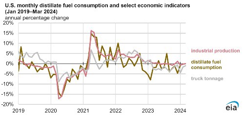 Economic indicators that correlate with U.S. distillate fuel consumption suggest subdued economic activity. Industrial production—which measures output from manufacturing, mining, and utilities—declined on an annual basis for the second consecutive month in February 2024 and showed no growth in March. The American Trucking Association’s truck tonnage index—which measures domestic freight such as manufactured and retail goods carried by trucks—declined 1% in March 2024 compared with the same month in 2023, the 13th consecutive month of year-over-year declines.