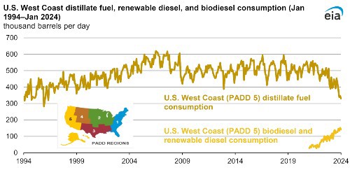 We recently started publishing the product supplied of U.S. renewable diesel and biodiesel separately, and we have published data for combined renewable diesel and biodiesel dating back to 2021. In January 2024, consumption of combined renewable diesel and biodiesel on the West Coast averaged 141,000 barrels per day (b/d), near its all-time high of 152,000 b/d set in December 2023. In contrast, West Coast consumption of petroleum distillate fuel averaged 330,000 b/d in January, the least for any month since May 1996.