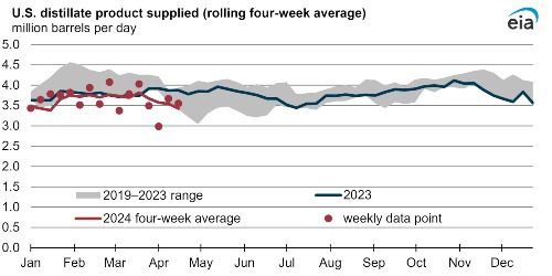 As reported in our Weekly Petroleum Status Report (WPSR), four-week average U.S. distillate consumption, which we track using product supplied, has been lower than the previous five-year (2019–23) range for most of 2024 (January 1 through April 19).