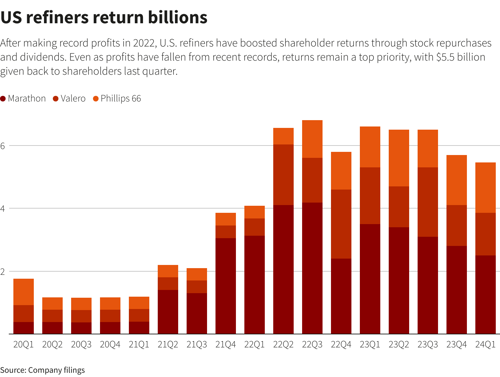 Three of the biggest U.S. independent oil refiners—Marathon Petroleum, Phillips 66 and Valero Energy—earned combined adjusted profits of $2.93 B and returned $5.5 B to shareholders through stock repurchases and dividends in the first quarter, according to Reuters calculations.