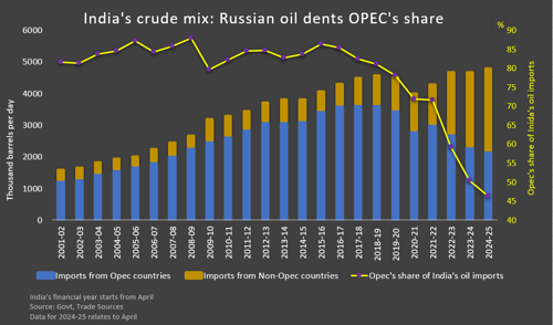 Lower imports from the Middle East further reduced the Organization of the Petroleum Exporting Countries' share in India's crude basket to 46% in April from 53% in March, the data showed.