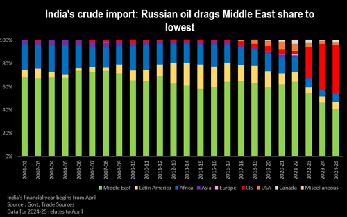 However, increased purchases of Russian oil dented Indian refiners' overall purchase of Iraqi and Saudi Arabian oil during the month, dragging down the share of Middle Eastern oil to 41% from 46% in March, the data showed.