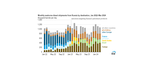 Sustained price caps resulting in increased export demand to countries not imposing the sanctions and refinery outages in early 2024 have reduced diesel and gasoline supply to Russia’s domestic market, which has led to increased domestic fuel prices and periodic fuel export bans in Russia. Monthly refinery runs began declining in January 2024 because of refinery outages from reported drone strikes and sanctions. An estimated 14% of Russia’s refining capacity came offline in the first quarter of 2024, even though declines do not usually occur until spring seasonal maintenance.